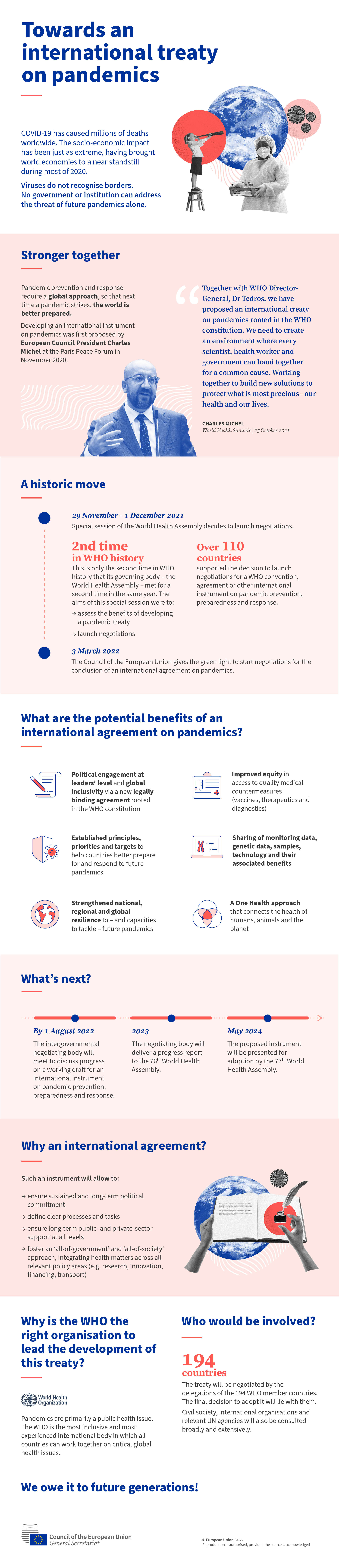 May 24, 2021, the European Council announced it supported the establishment of an international Pandemic Treaty, under which the WHO would have the power to replace the constitutions of individual nations with its own constitution under the banner of "pandemic prevention, preparedness and response."21