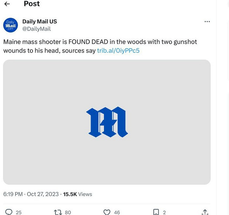 Robert Card, the man accused of mass murder in Maine, has been found dead in the woods. Initial reports indicated he was found with TWO gunshot wounds to the head, which would indicate he was killed by someone else. But within minutes the original story was changed from two to one "self-inflicted" wound.